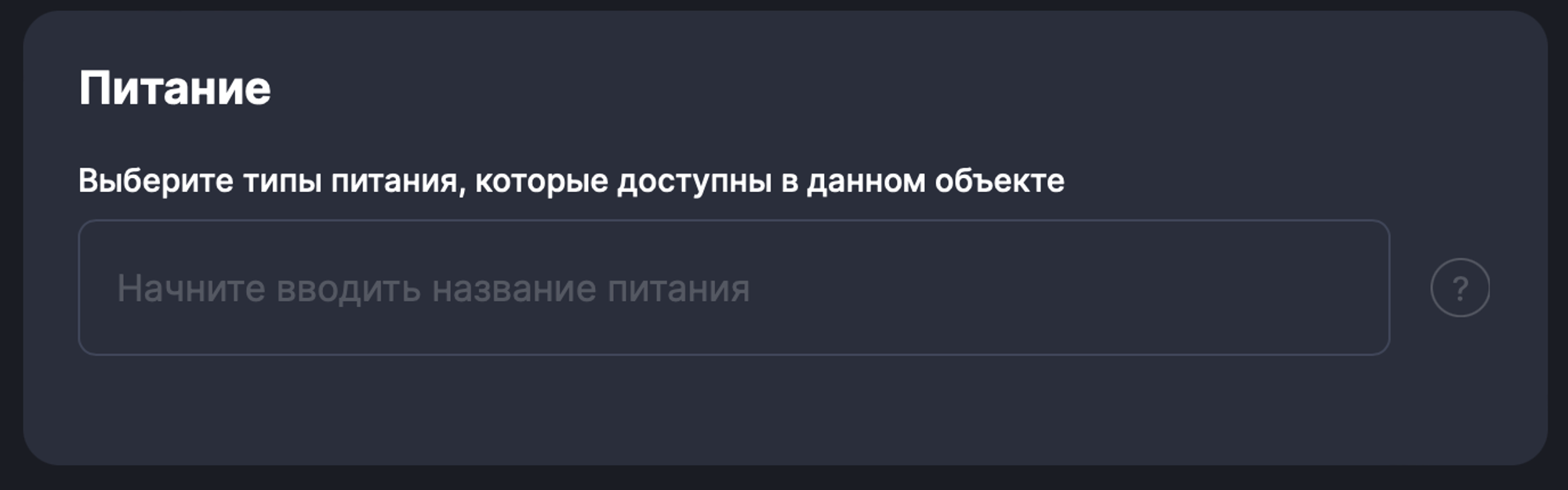 Питание необходимо сначала добавить в меню “Услуги”, вкладка “Питание”. Вы сможете отредактировать объект позже и добавить варианты питания.