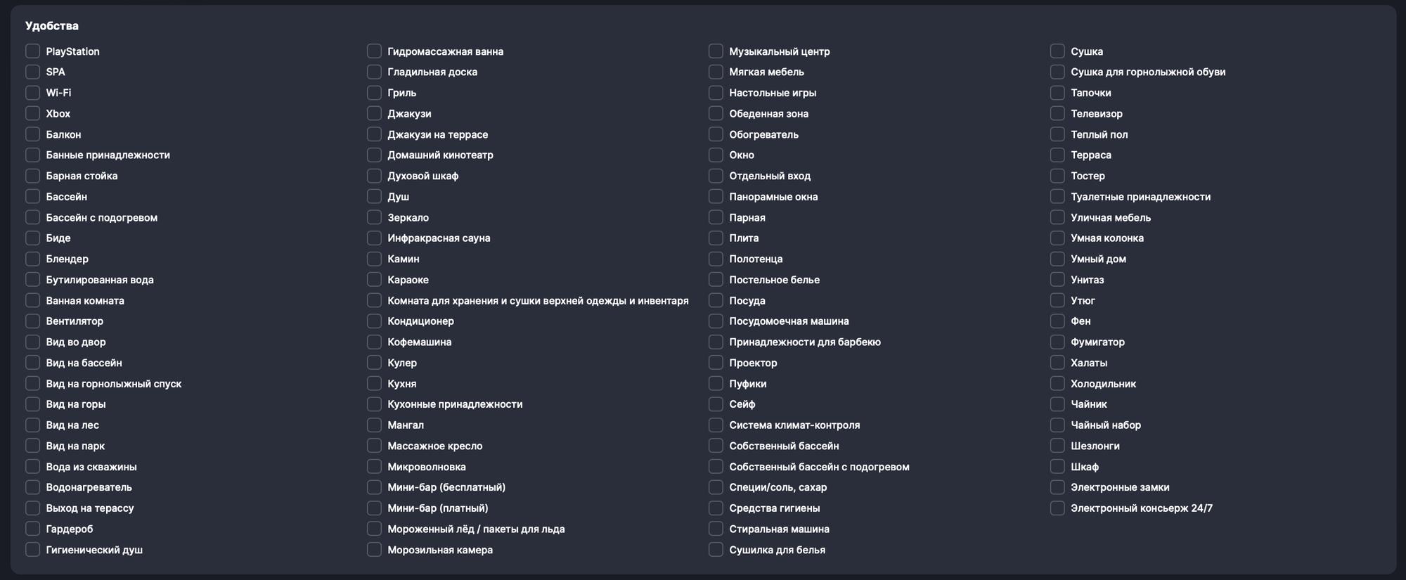Отмечайте те удобства, которые клиент найдёт конкретно в данном номере/объекте: