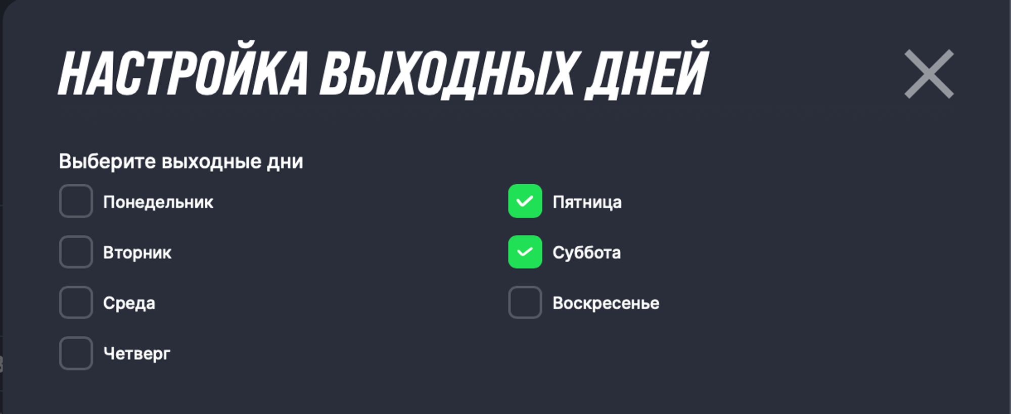 - Кнопка “Настроить выходные” помогает настроить выделение серым цветом выходных в каледнаре