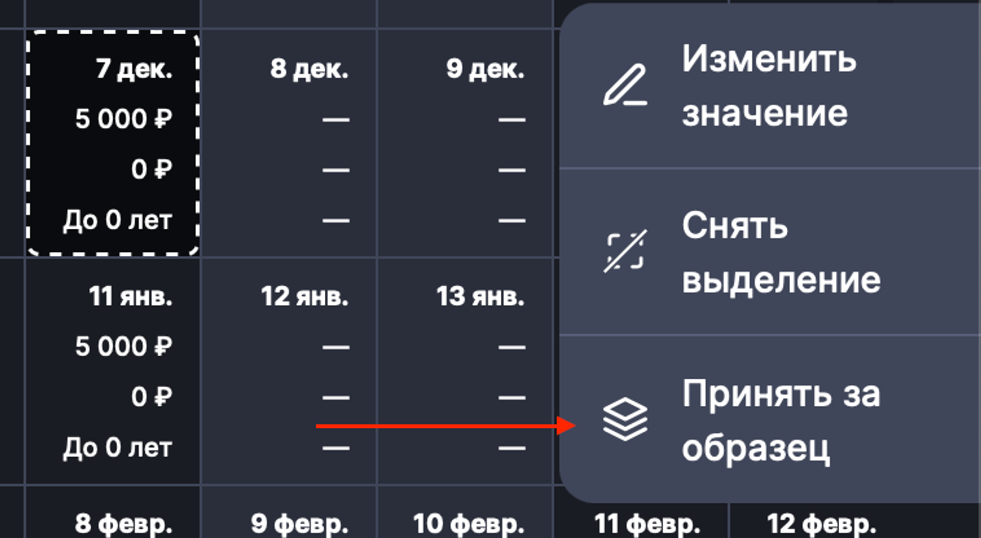 Выберите нужные даты мышкой и нажмите “Изменить значение”