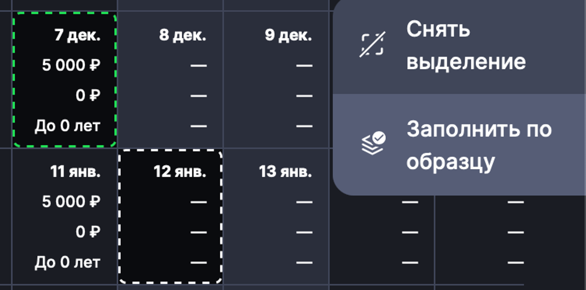 Также, вы можете выделить одну из уже заполненных клеток, принять за образец настройки этой даты и применить их для других дат.