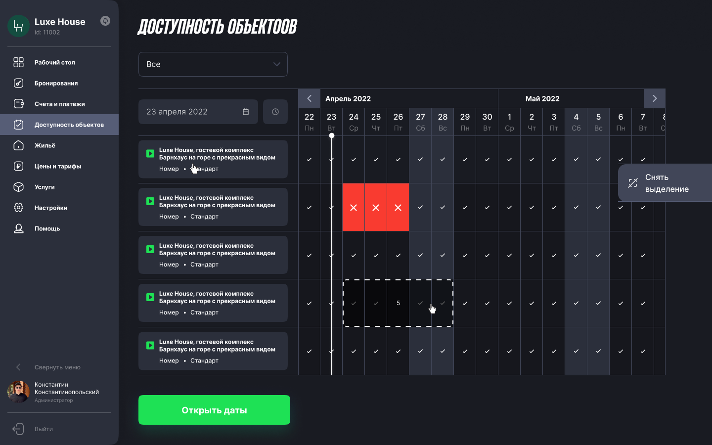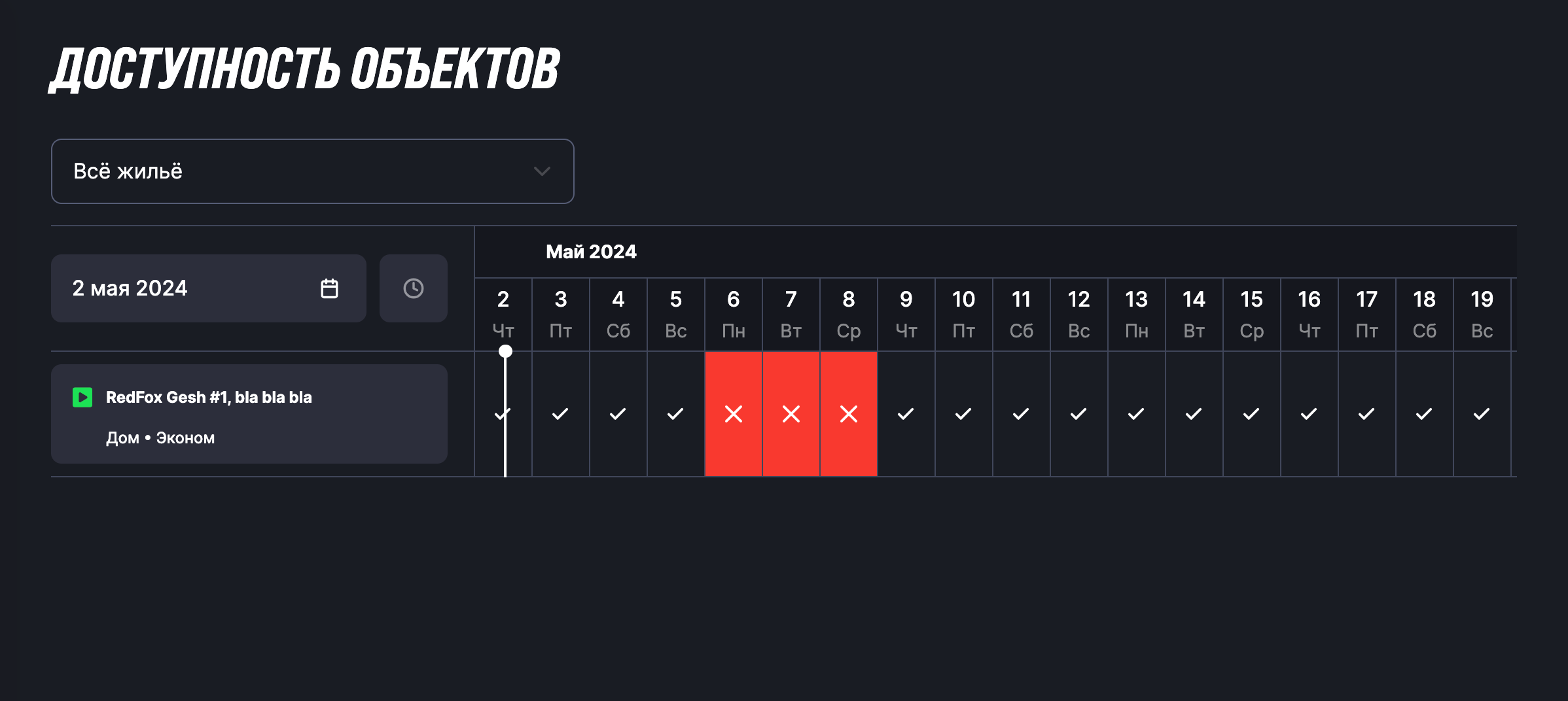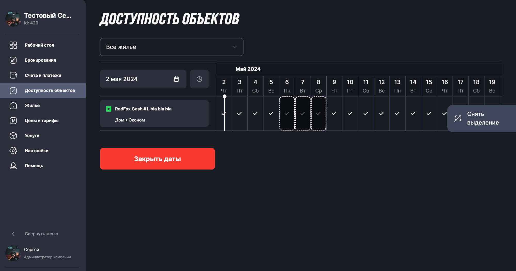 Для этого перейдите в раздел: «Доступность объектов», отметьте даты, которые заняты и недоступны, а после нажмите «Закрыть даты»