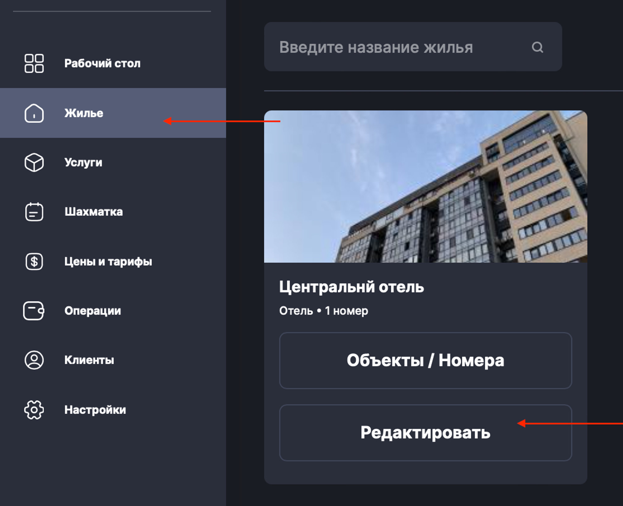 Заходим в меню “Жильё” и нажимаем “Редактировать” у комплекса, которому хотите добавить услугу
